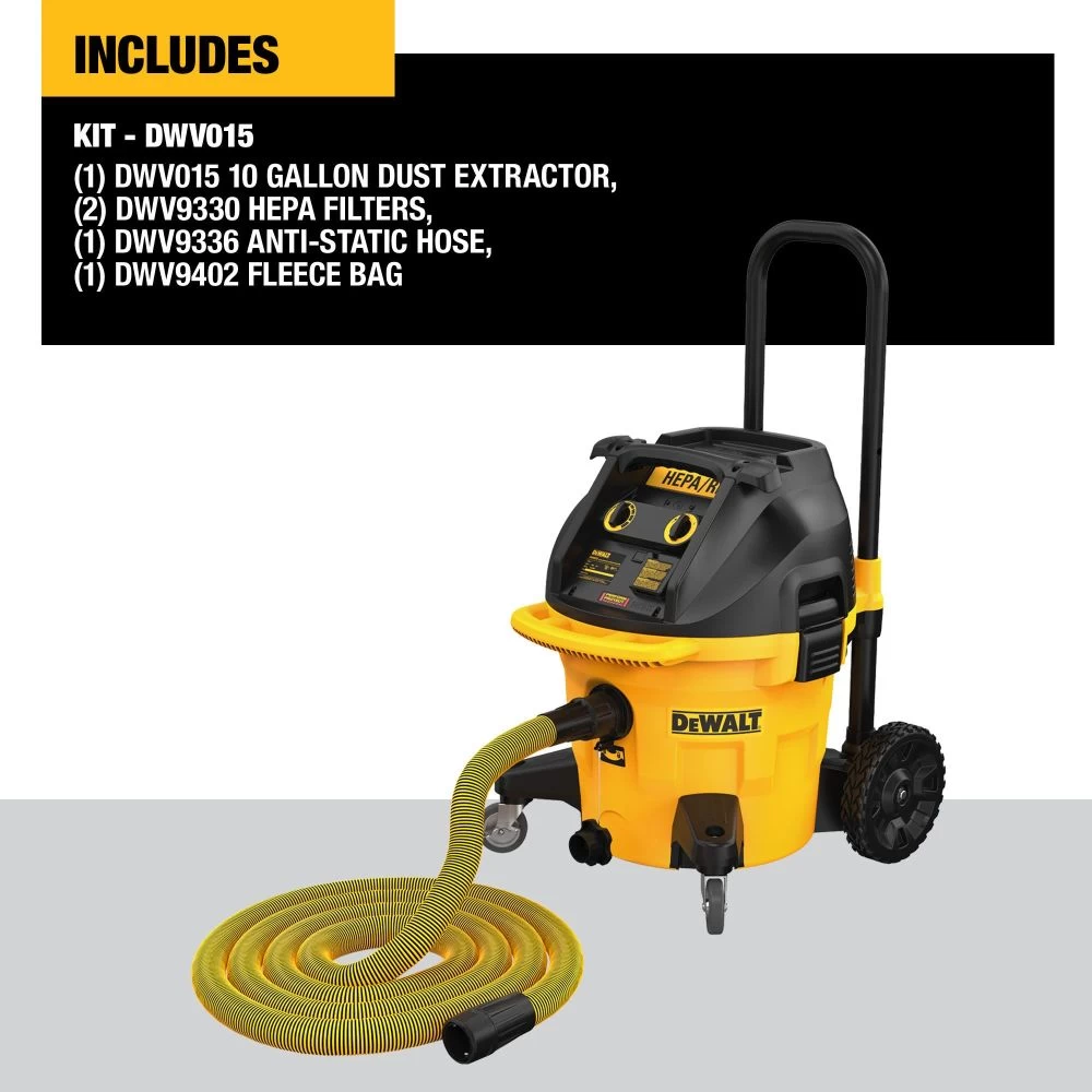 The DWV015 10 Gallon Wet/Dry HEPA Dust Extractor with Automatic Filter Cleaning provides a powerful dust collection solution that allows users to be in compliance with current 1926.1153 OSHA dust regulations. The dust extractor delivers up to 155 CFM suction, with 73″ static water lift. The automatic filter cleaning system initiates filter cleaning continuously every 30 seconds. Pairing the powerful dust extractor with fleece vacuum bags (DWV9402) and a 99.97% efficient HEPA filter (DWV9330) provides even more protection against releasing harmful dust into the work environment. This tool comes Tag Readyâ„¢ so users and companies can attach the DEWALT Tagâ„¢ (sold separately) and track its location virtually anywhere via the TOOL CONNECTâ„¢ System through the DEWALT Site Managerâ„¢ app. For added convenience, the 10 Gallon