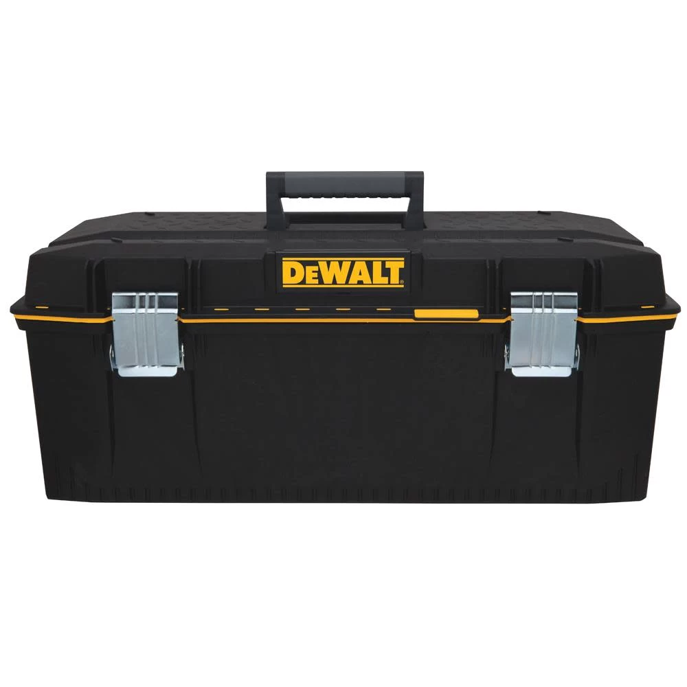The DEWALT 28 In. water seal tool box has an all round water seal to help protect the contents. The portable tote tray is designed for storing large tools and power tools. The latches that lock the tool box are made of rust proof metal. This box has a 100 lbs load capacity with 9.2 gal of useful volume. For carrying heavy loads, there are hand lifting recesses incorporated on the sides of the box.