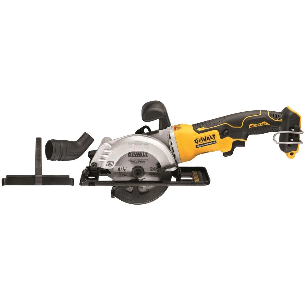 The DeWALT Atomic 20 Volts Max cordless circular saw is powered by a brushless motor that allows to cut up to 369 linear-feet of 3/4 Inch OSB. Bevel gear design ensures that you can cut 2X more material at 90 degrees and 1x material at 45 degrees. The electronic blade brake stops blade quickly for safety. Convenient on-board blade key storage allows users to change blades with ease. Elongated handle optimizes reach for rip cutting OSB and plywood.
