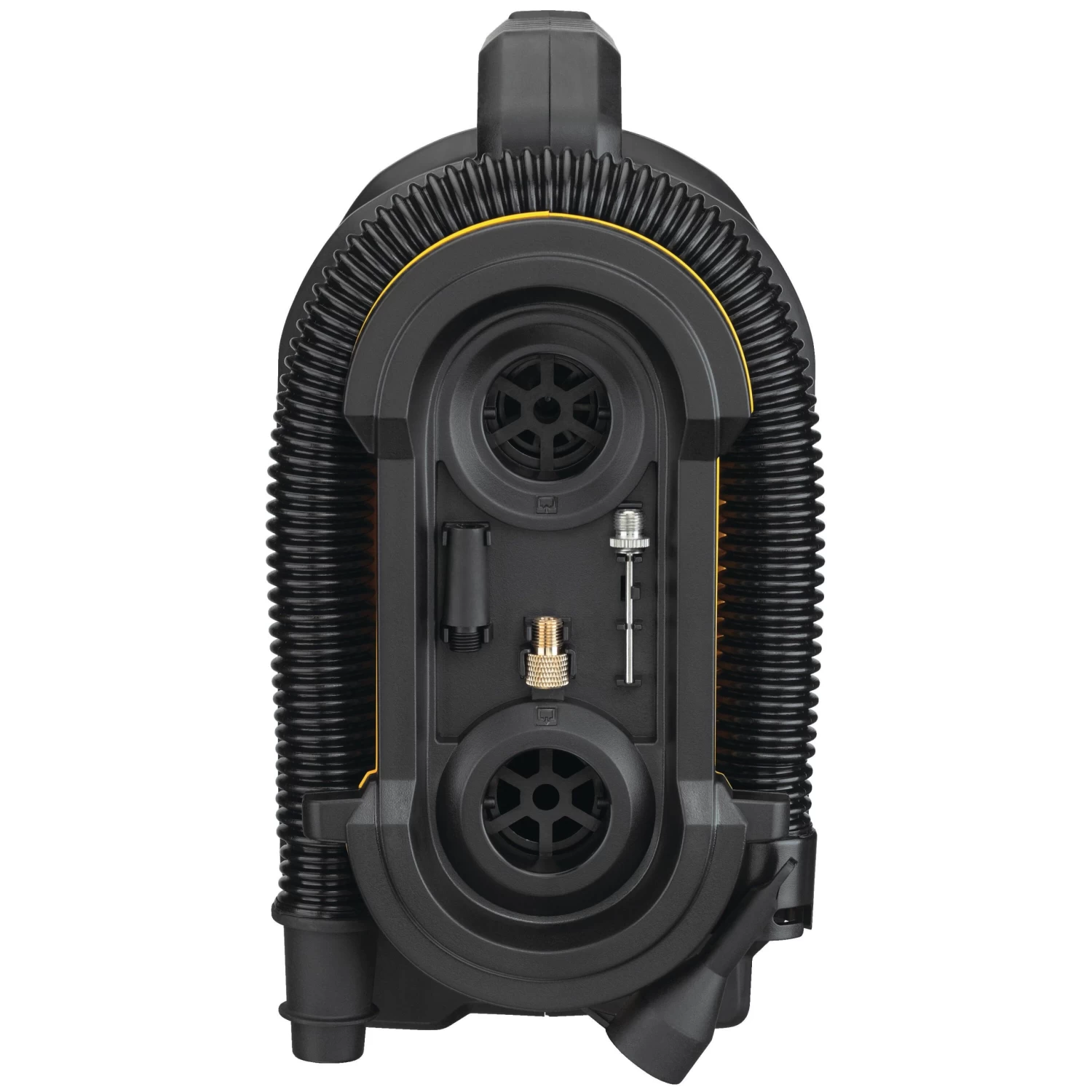Our 20V MAX Corded/Cordless Air Inflator can run on any one of three power sources* for maximum versatility: 20V MAX battery, 12V DC, or 110V AC. Use it on the jobsite, or on the go. It features a high-pressure rubber hose for durability. The threaded chuck and included onboard accessories make it easy to inflate items from tires to footballs. Setting desired air pressure is simple with the digital gauge, and the auto-shutoff provides accurate inflation. The high-volume hose allows fast inflation of mattresses and other inflatables with the push of a button. Move the hose to the deflation port for quick and easy take down. An onboard LED light helps to provide illumination in dark spaces. Heavy-duty rubber feet help reduce walking while in use.