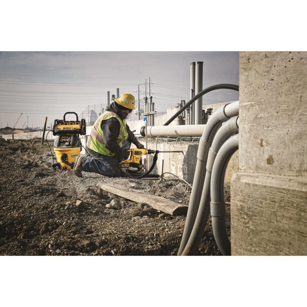 The DeWALT® 10-Gallon Wet/Dry HEPA Dust Extractor with Automatic Filter Cleaning makes fast work of your jobsite cleanup. It features a 15-amp motor that allows it to suck up to 155 cubic feet per minute for quick results. The DeWalt dust extractor’s 15-foot hose lets you set up the unit where you need and reach tricky spaces virtually anywhere in the room. You can use the telescoping handle to wheel the extractor unit around without lifting it up. This HEPA dust extractor’s filter meets the EPA regulations governing lead removal for safety and environmental responsibility. Variable speed lets you adjust the airflow to suit your current job requirements.
