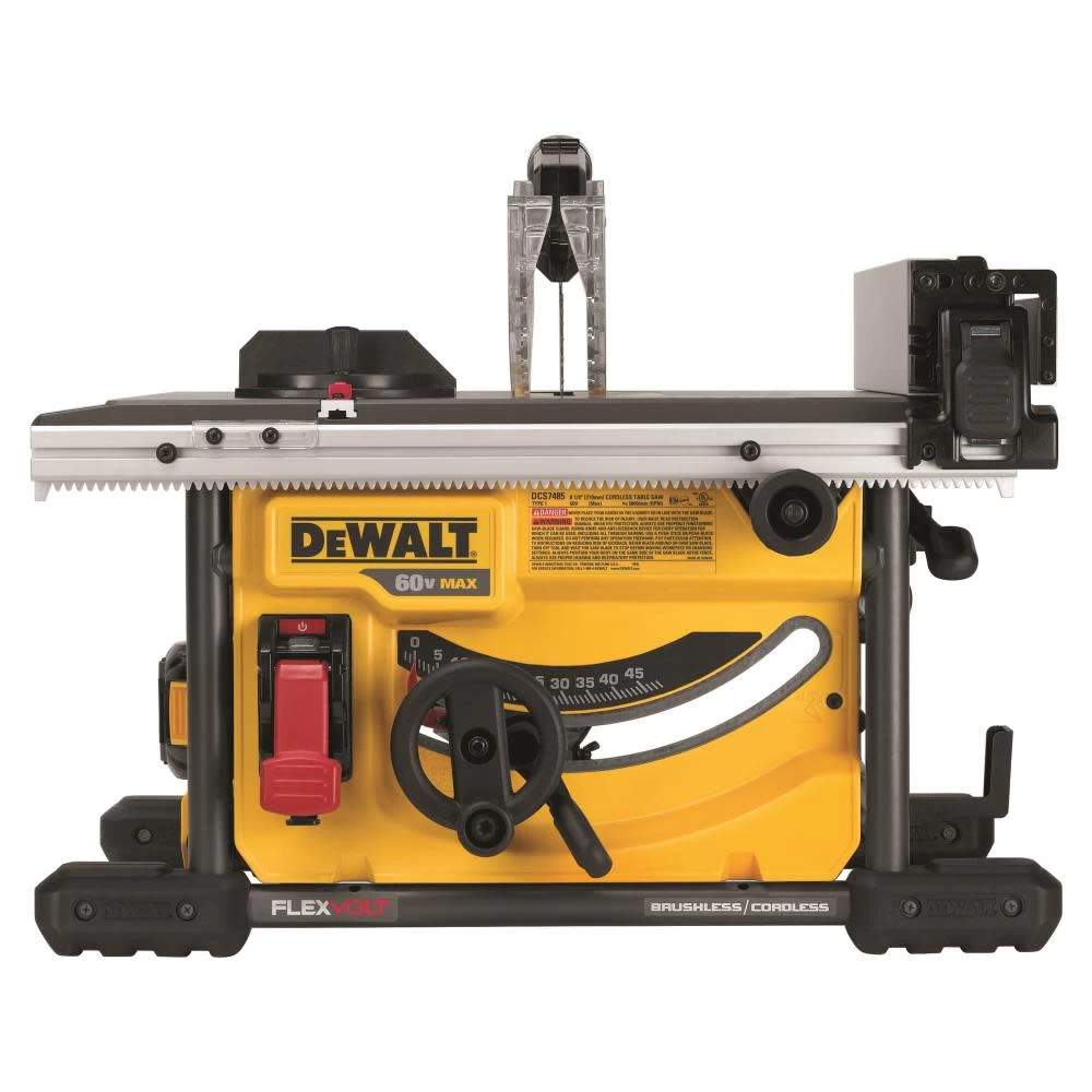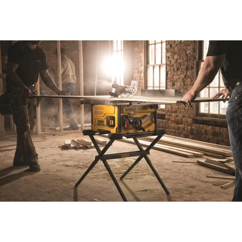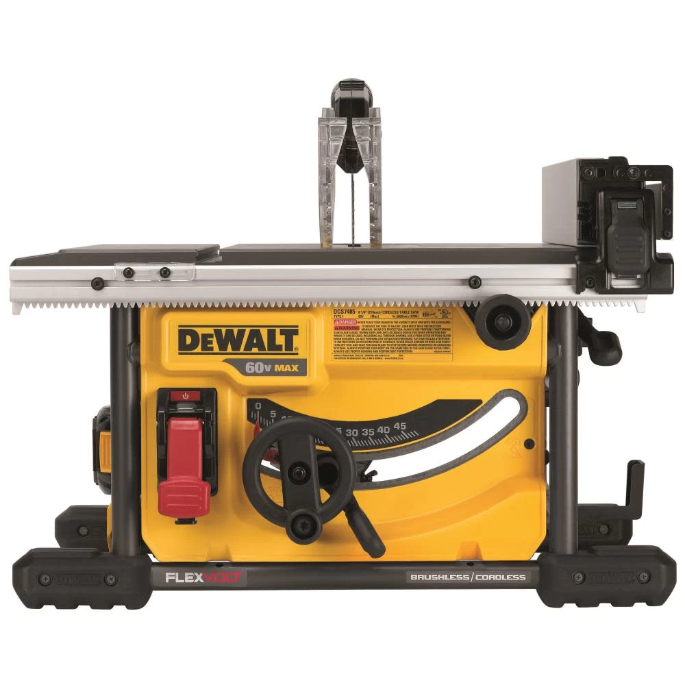 The DEWALT® FLEXVOLTâ„¢ 60V Table Saw 1 Battery Kit contains the items necessary for cutting through common materials quickly and easily. This saw uses the power of a 60V FlexVolt battery, which improves runtime while also making the unit portable. With its rack and pinion fence rails, the DEWALT FlexVolt 60V Max 8-1/4-inch table saw kit lets you avoid lengthy adjustments to fences, making the task fast and easy. The saw boasts a max rip of 24 inches, which is ideal for OSB and 4×8 plywood sheets. Save time and increase productivity with its tool-free guarding adjustment. If your electricity goes out while the saw is in the ‘on’ position, the Power-Loss Reset feature prevents it from starting automatically when the electricity comes back on. For convenience, onboard storage is available for fences, guards and more. The table for this saw is aluminum for durability. It also features a special coating that helps reduce friction while cutting. The DEWALT table saw fence extension kit has a metal roll cage base, which offers excellent durability and stability.