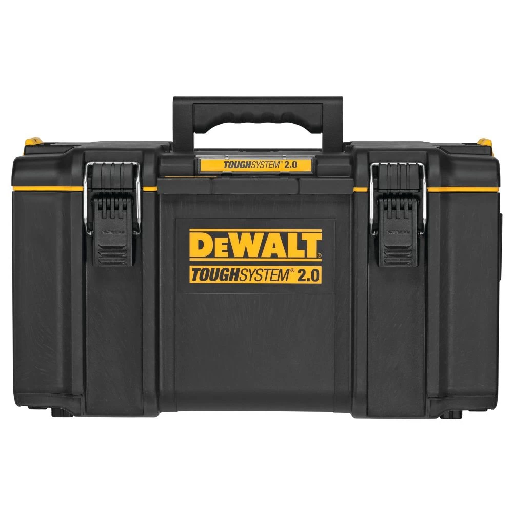 The DeWALT ToughSystem 2.0 large toolbox with a load capacity of 110 lb offers more storage capacity than regular toolboxes. Auto-connect side latches facilitate single-handed operation and the two-piece metal front latches gives more stability when storing the tools. IP65 rating prevents the accumulation of dust and water on the surface. Detachable inner tray makes it easy for optimization.