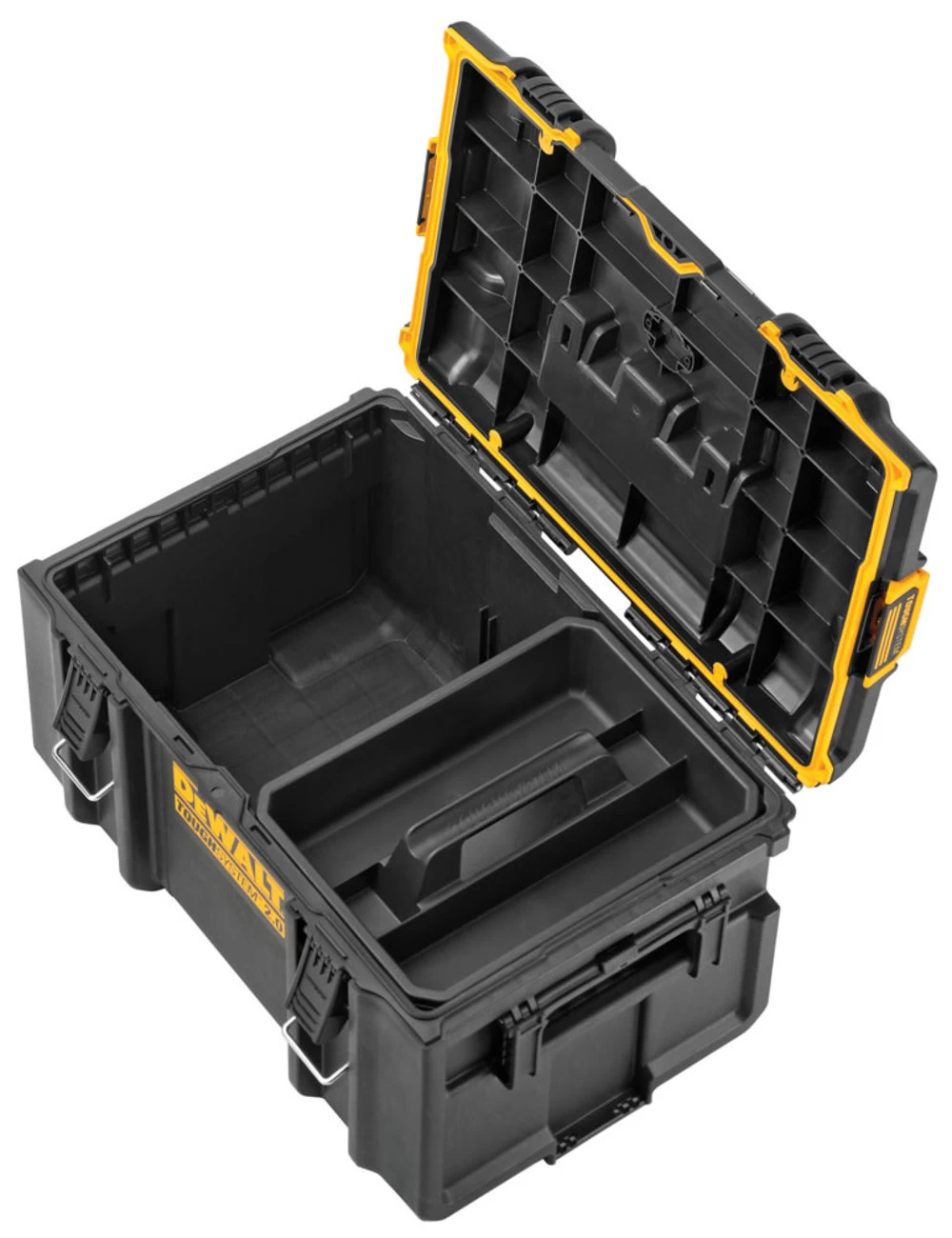The ToughSystem 2.0 rolling tower contains a toolbox, extra large toolbox and a rolling toolbox. Tower allows the user to stack all the storage products in a single unit and take it to the jobsite. Auto-connect side latches facilitate single-handed operation and the two-piece metal front latches gives more stability when storing the tools. IP65 rating prevents the accumulation of dust and water on the surface. Two large organizer cups with removable dividers as well as the removable inner tray enables the user to organize the tools. Padlock eye features a metal reinforcement for more safety.